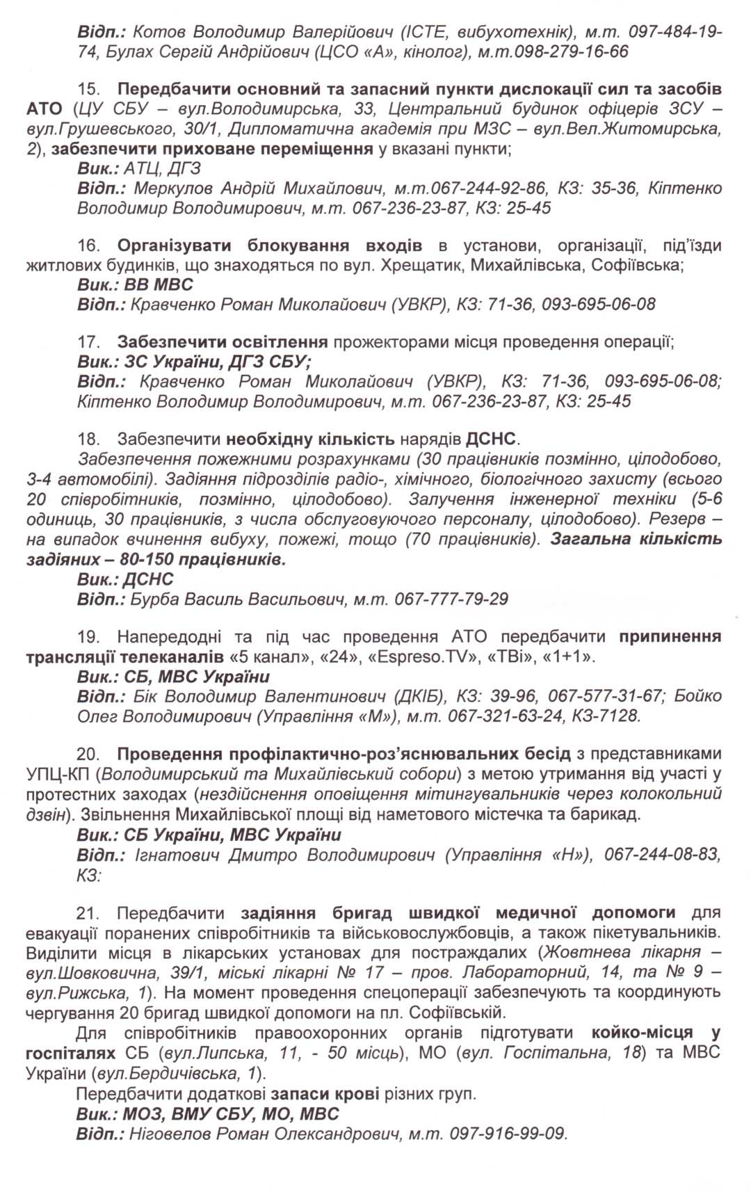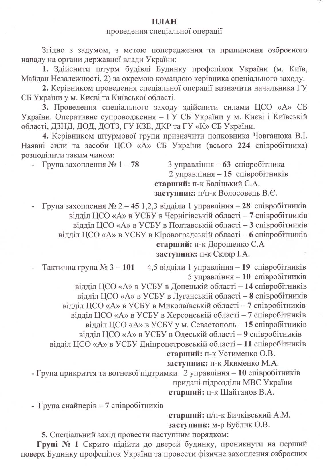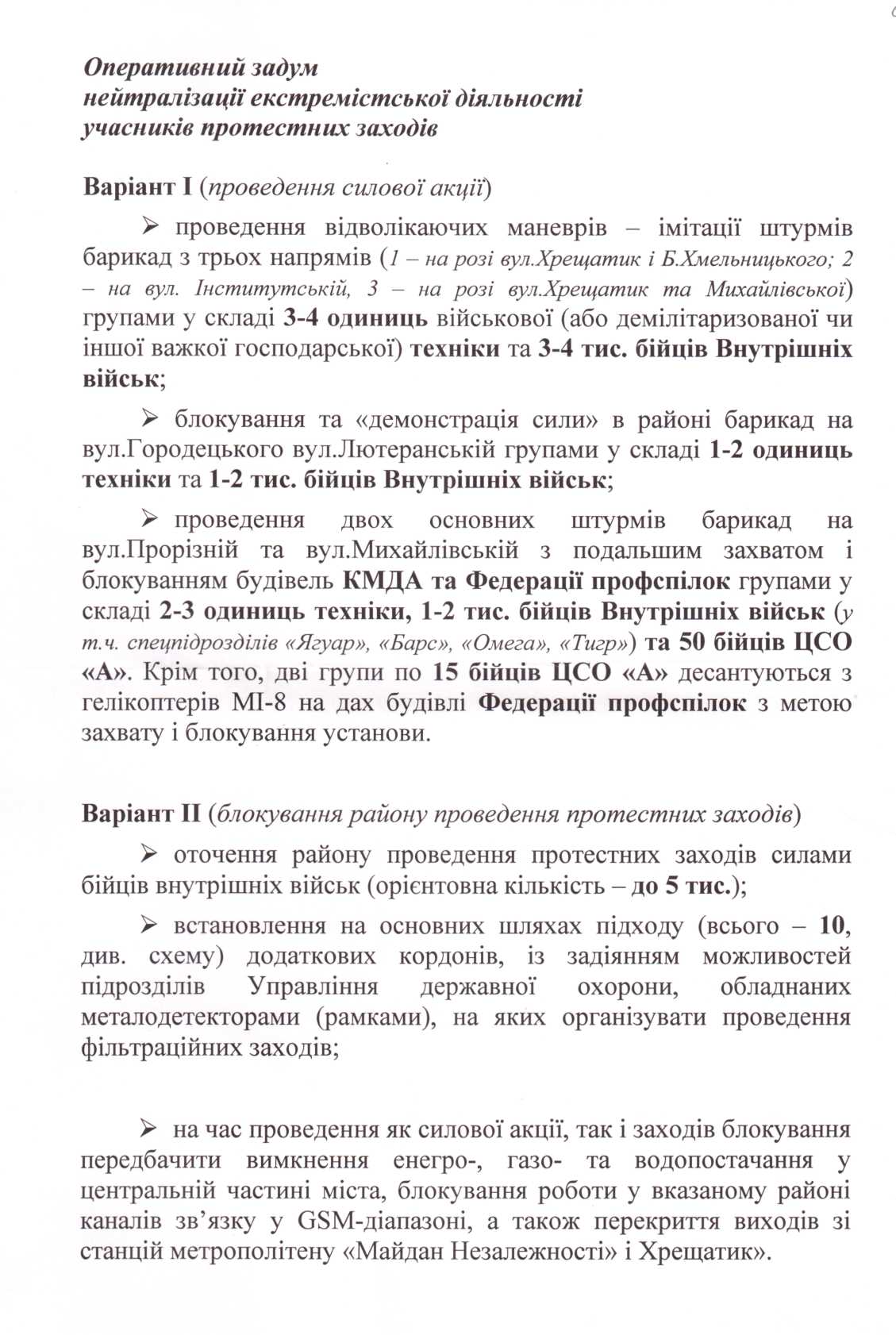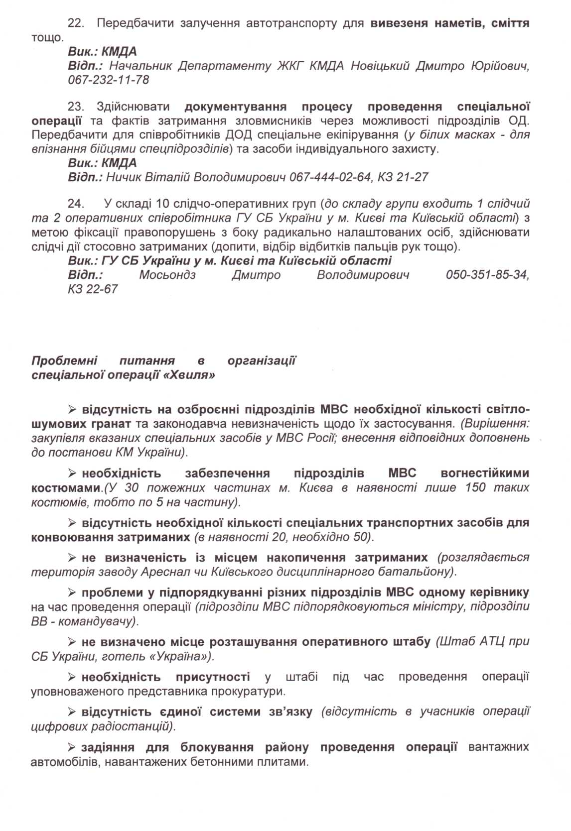 З огляду на це я вирішив оприлюднити частину планів “Хвиля” та “Бумеранг” — документи, які доводять, що снайперами на вул.Інститутській були бійці підрозділу спеціальних операцій внутрішніх військ, яким керує полковник С.Асавалюк, та бійці підрозділу внутрішніх військ “Омега”. Крім того, вказівку на застосування зброї колишній міністр МВС В.Захарченко дав спецпідрозділу ГУБОЗ МВС “Сокіл”. Надаю прізвища та номери телефонів керівників підрозділів, що брали участь у силовому розгоні акцій протесу. На підставі цих даних Генпрокуратура має відкрити кримінальні провадження. Після цього я добровільно передам слідчій групі ГПУ решту матеріалів, які вказують на причетність до кривавих подій міністра МВС В.Захарченка (котрий особисто заявив 20 лютого, що віддав наказ про застосування бойової зброї), його заступника В.Ратушняка, начальника департаменту громадської безпеки МВС О.Крикуна, командувача внутрішніх військ МВС С.Шуляка, в.о. начальника ГУМВС у м.Києві В.Мазана, голови СБУ О.Якименка, його першого заступника В.Тоцького, начальника УСБУ в Києві та Київській області О.Щоголєва, командирів підрозділу СБУ “Альфа”. Допомогу в підготовці спецоперацій МВС та СБУ надавав колишній перший заступник ГРУ Російської Федерації, котрий проживав у готелі “Київ” (його проживання й харчування оплачувала СБУ). Українська влада задіяла фахівця з Росії, оскільки наш очільник СБУ виявився льотчиком, а міністр МВС — ОБХСС-ником. Всі дані росіянина будуть надані Генпрокуратурі, а ступінь його вини хай визначає слідство. Крім того, я готовий передати Генпрокуратурі матеріали, які вказують, що при силовому розгоні акцій протесту МВС та СБУ діяли, як організоване злочинне угруповання.