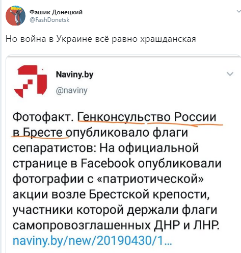 Генеральное консульство России в Бресте (Беларусь) опубликовало пост о международном мотопробеге "Дороги Победы - на Берлин 2019 год", прикрепив под ним фото с "флагами" псевдо республик ЛДНР.