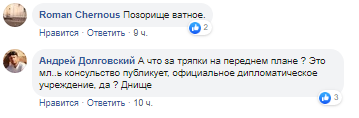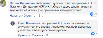"Любопытно,куда смотрит белорусский КГБ?Луганск и Донецк это УКРАИНА. К чему здесь флаги никем (в том числе и Россией) не признанных квазиреспублик?", "Белорусское КГБ ловит противников аккумуляторного завода и переименовывает дорожные указатели с белорусского на русский", "Позорище ватное", "А что за тряпки на переднем плане? Это мл..ь консульство публикует, официальное дипломатическое учреждение, да ? Днище", - пишут комментаторы.