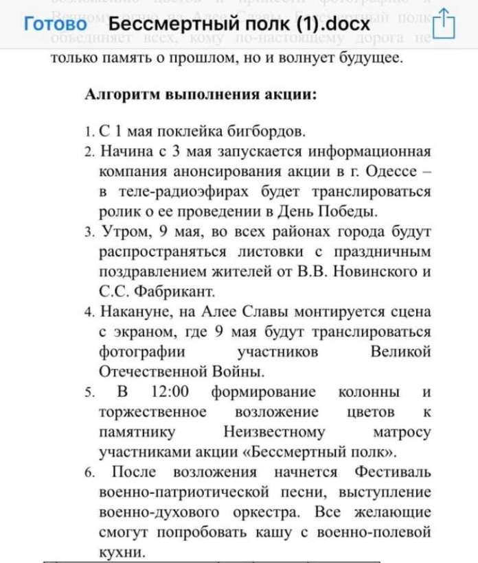 Одним з пунктів підготовчих заходів є роздача листівок з привітаннями від нардепа Вадима Новинського та екс-депутата і члена партії “Сильна Україна” Світлани Фабрикант. Також для популяризації “Безсмертного полку” планується розпочати активну бордову кампанію.