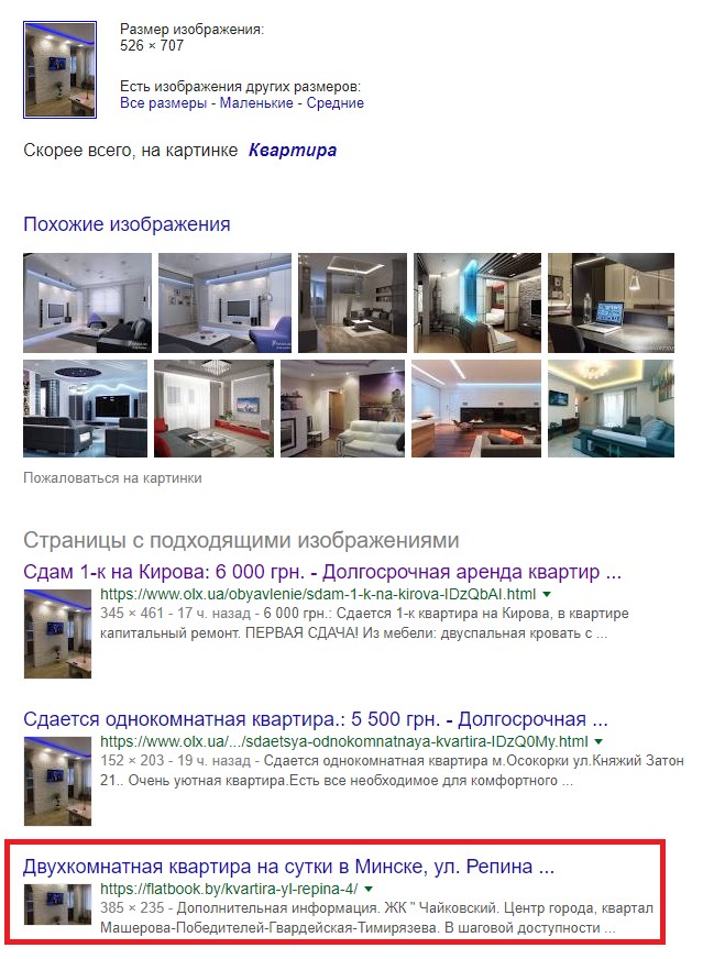 Но не прислала. Подождав несколько часов, я попыталась ей позвонить, но телефон был отключен. На следующий день тоже не выходила на связь. Уже понимая, что здесь что-то не так, я рассказала об этой ситуации своей подруге. Она посоветовала мне открыть объявление и проверить размещенные там фотографии по поиску картинок в браузере Google Chrome. Я это сделала. И нашла те же самые фотографии в объявлении «Квартира на сутки в Москве»! Стало понятно, что объявление, на которое я повелась, было фальшивым. И чтобы понять это, достаточно было проверить фотографии.