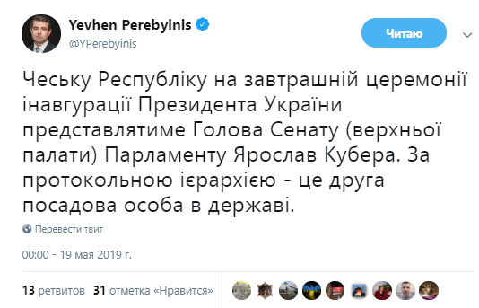 “Чешскую Республику на завтрашней церемонии инаугурации президента Украины будет представлять Председатель Сената (верхней палаты) парламента Ярослав Кубера. По протокольной иерархии – это второе должностное лицо в государстве”, – написал в Twitter посол Украины в Чехии Евгений Перебийнис.