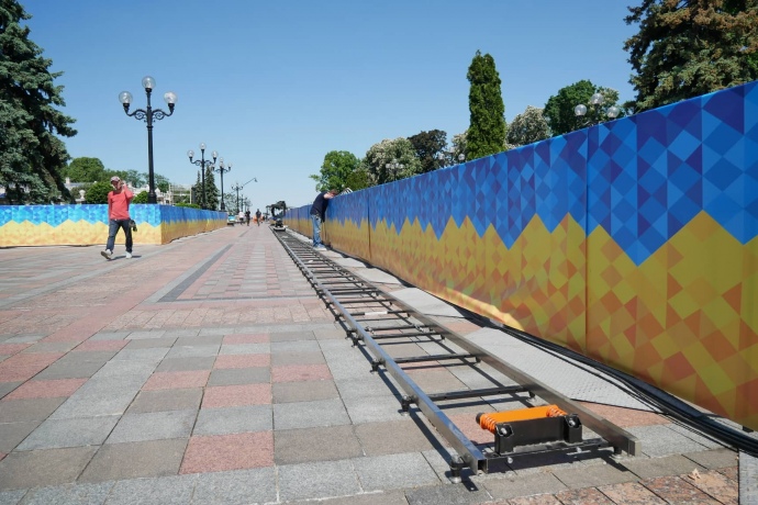 Площадь между ВР и Мариинским парком разделена желто-голубыми забором.