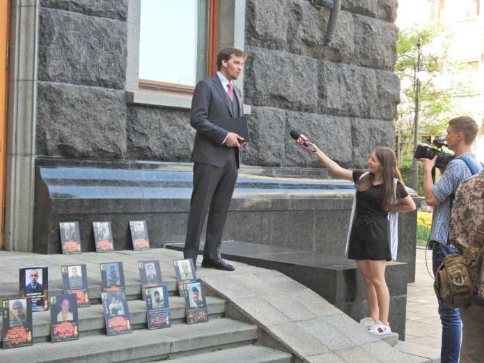 На сходах Адміністрації президента волонтери встановили таблички з загиблими бійцями, перекривши прохід співробітникам АП.
