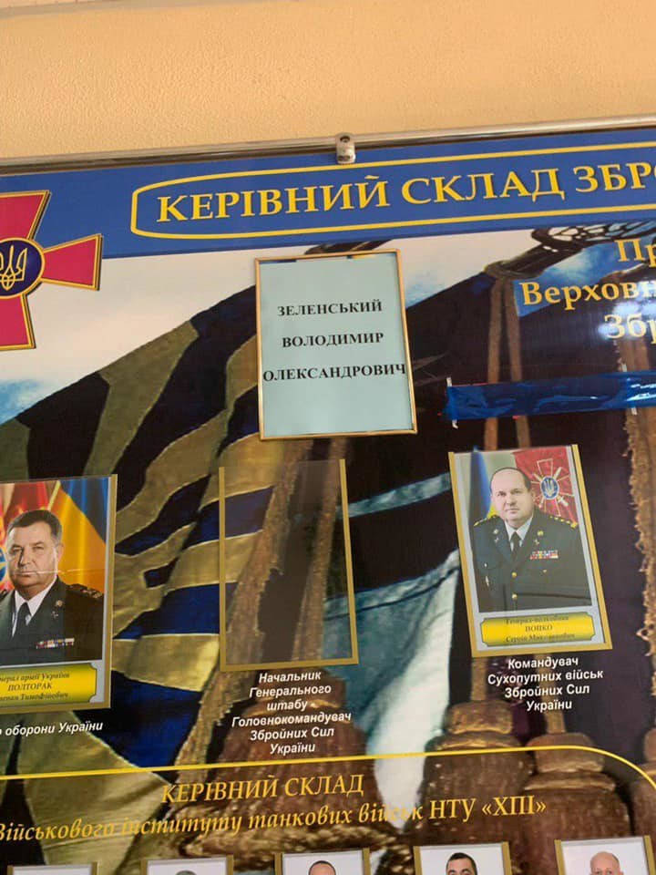 Отмечается, на стенде рядом с фотографиями военачальников Украины изображение Зеленского заменили листом формата А4 в рамке. На бумаге напечатано анкетные данные президента - его фамилия, имя и отчество.