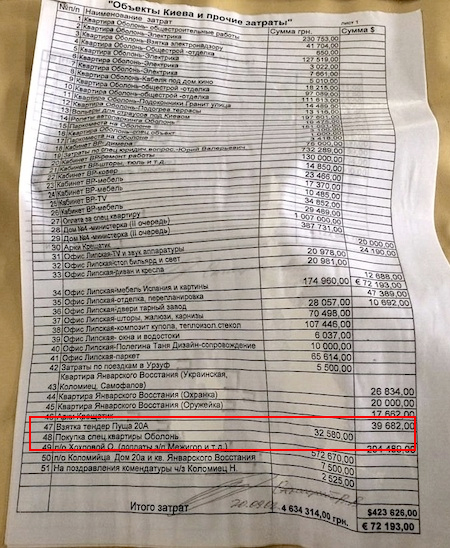 Например один документ, в котором в графе расходов даже значится "взятка за тендер" в размере 32 тысячи 580 гривен.