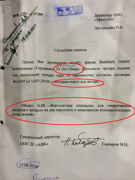 Например, есть служебная записка об оплате 54 164,10 евро за ворота для ангара вертолетной площадки, привезенные из Германии.