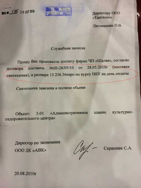 Также есть служебная записка с просьбой оплатить 13256,36 евро за сантехнику в "административное здание культурно-оздоровительного центра".