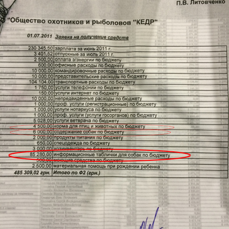Среди расходов в бюджете указаны 6000 гривен на содержание собак, на корм для птиц и зверей - 4500, а на какие-то информационные таблички - 85 280 гривен.