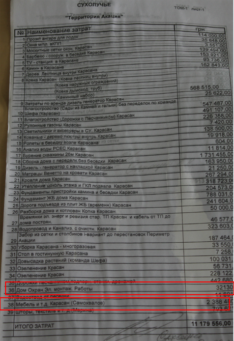 Кроме того, есть документы о расходах в резиденции президента Сухолучье. Так, например, только на один из объектов Схолучье - "Территория акация " было потрачено более 11 миллионов гривен с каменными садами за полмиллиона и мебелью стоимостью более двух миллионов. При этом стоимость строительства дома для охраны составила чуть больше 32 тысяч гривен.