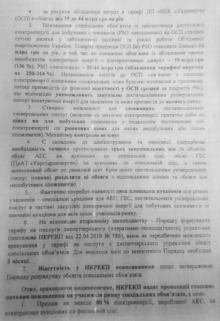 "НКРЭКУ предоставляет предложения относительно  вопроса возложение на участников рынка специальных обязанностей, а именно: 1. продажа не менее 80% электричества, произведённого  АЭС, на электронных аукционах по фиксированной цене 2. продажа не менее 50% электричества, произведённого  ГЭС, на электронных аукционах по фиксированной цене 3. закупка поставщиком универсальных услуг на электронных аукционах определенного объема электрической энергии 4. закупка операторами сетей (ОСП и ОСР) на электронных аукционах определенного объема электрической энергии в целях компенсации технологических потерь  электрической энергии на ее передачу/распределение; 5. обязать АЭС заказывать в ПУП и оплачивать услуги по обеспечению доступности электроэнергии для бытовых потребителей", - говорится  в письме.
