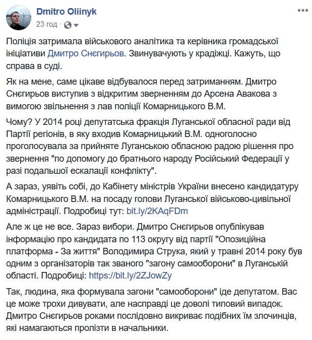 “Зараз вибори. Дмитро Снєгирьов опублікував інформацію про кандидата по 113 округу від партії “Опозиційна платформа – За життя” Володимира Струка, який у травні 2014 року був одним з організаторів так званого “загону самооборони” в Луганській області”, – повідомив журналіст.