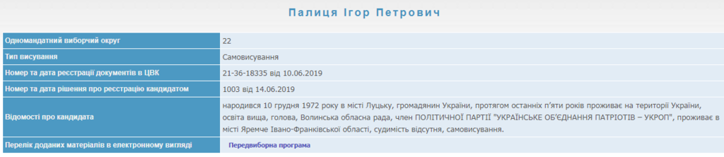 Как указано на сайте Центральной избирательной комиссии, Игорь Палица баллотируется в парламент по 22 мажоритарному округу в Луцке. При этом его главным оппонентом от президентской партии будет малоизвестный врач-флеболог Сергей Писачук.