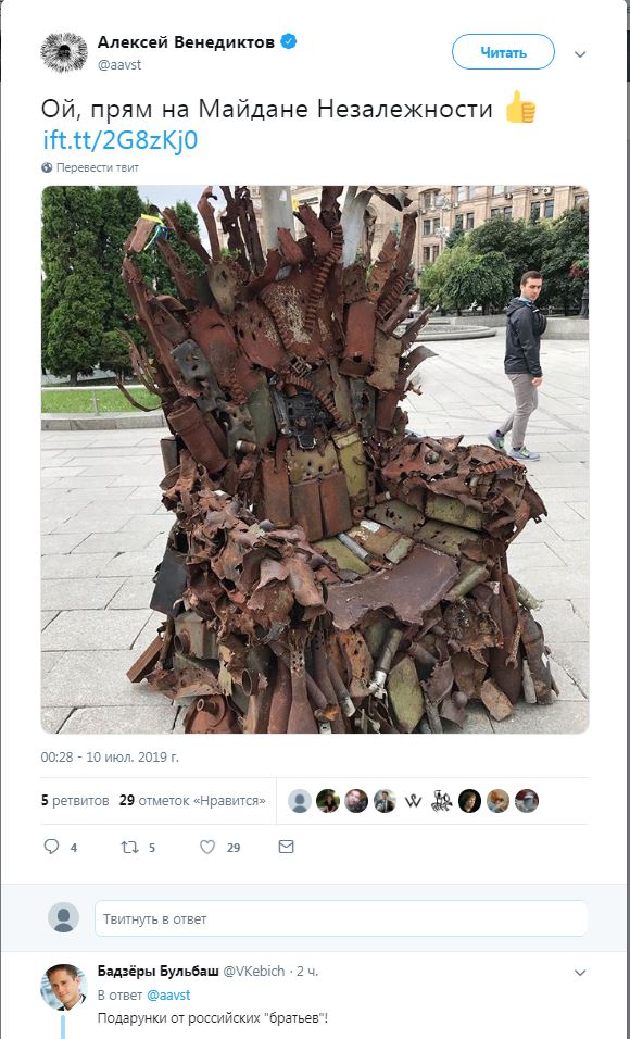 Также Алексей Венедиктов поделился в социальных сетях фотографиями, сделанными во время прогулки по Киеву. Одна из них — «Железный Трон», собранный из обломков военной техники из зоны проведения операции Объединенных сил на Донбассе. Инсталяцию создали из обломков танковой брони, частей подбитой военной техники, пулеметных ленты, снарядов, канистр и солдатских фляг.