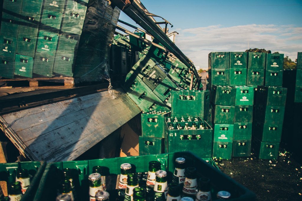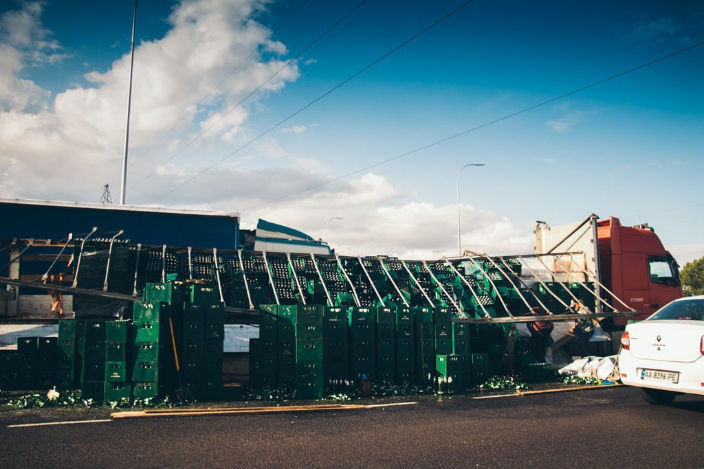 По словам водителя фуры, он ехал из Киева в Харьков и во время поворота из прицепа стали сыпаться бутылки. Он предполагает, что груз был плохо закреплен, именно поэтому и произошло такое "горе для любителей хмельного".