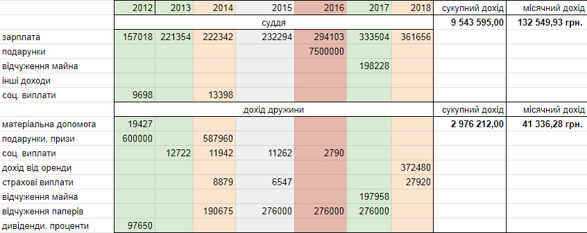Мы проанализировали доходы Михаила Феодосиевича за 2012, 2013, 2014, 2015, 2016, 2017 та 2018 годы. Его заработки регулярно формировались из судейского вознаграждения, частично от продажи имущества. Однако наибольшее внимание привлекает подарок в размере 7,5 млн грн, к которому мы вернемся чуть позже.