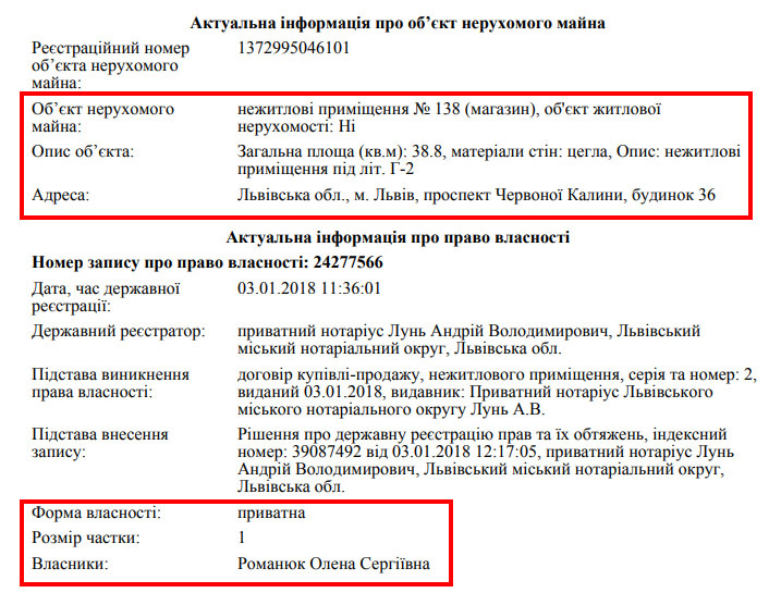 Также недавно у нее появилось нежилое магазинное помещение площадью 38,8 кв.м, приобретенное за 270 000 грн. По этому адресу находится городской торговый центр.