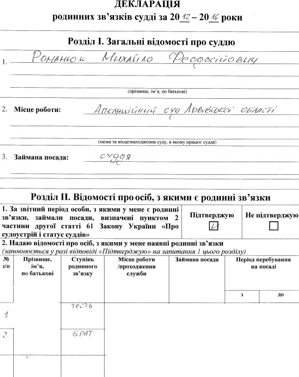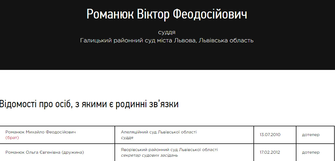 В прошлом году он проходил собеседование в пределах квалификационного оценивания, но комиссия его приостановила из-за лжи в декларации родственных связей с 2011-2016 года. Туда Романюк не вписал жену Ольгу, которая в этот период работала секретарем судебного заседания в Яворовском райсуде Львовской области.