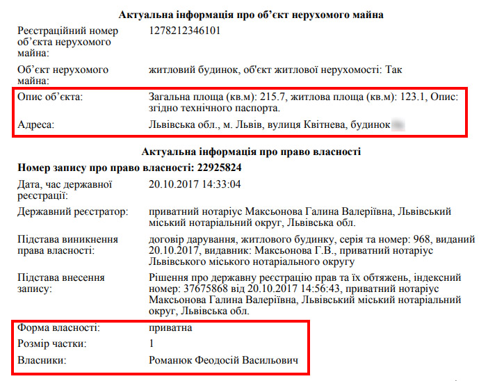 В собственности жены Елены Романюк с 2009 года тоже немалая квартира площадью 173 кв. м во Львове, которая досталась ей от бабушки. Сама же бабушка приобрела ее незадолго до передачи внучке за 45 530 грн.