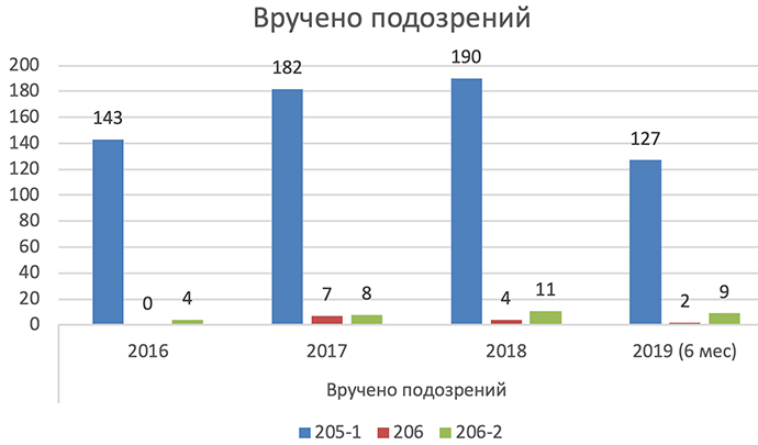 К тому же, производства по статьям 206 и 206-2 вообще не выливаются в реальные дела с выдвижением подозрений, а тем более — с передачей в суд.