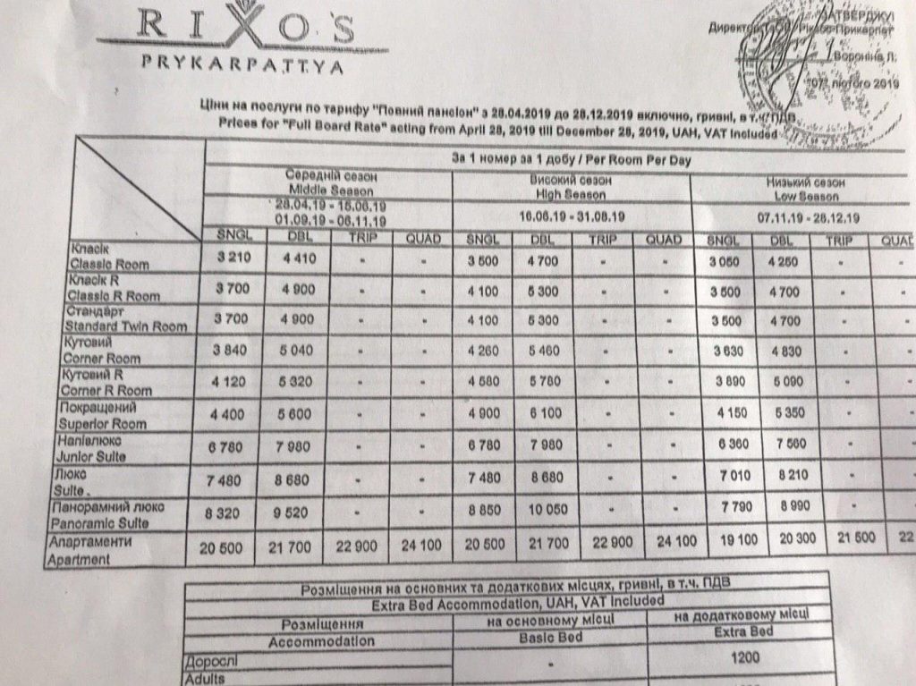 “Риксос” является одним из самых дорогих отелей в регионе: согласно официальному прайсу, сегодня, в “высокий сезон” номер сингл стоит 3500 грн, а дабл – 4700 с питанием.