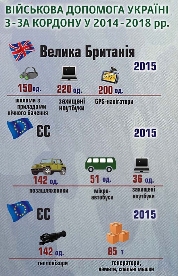 Великобритания помогла украинской армии защищенными ноутбуками, GPS-навигаторами, тепловизорами и т.д. Франция предоставила бронежилеты, Канада – различную амуницию, Германия – реанимобили, медицинское оборудование, Дания – GPS-навигаторы, а Словакия передала генераторы и комплексы осветления.