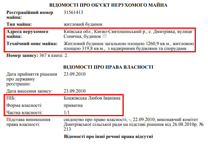 Из досье также известно о матери Блаживской Любови Ивановны, которая ранее была заместителем директора по развитию в ЗАО «Львовский мясокомбинат». Она зарегистрировалась в Киеве сразу после переезда мужа в ГПУ. А вскоре на Любовь Ивановну записали огромный особняк размером с торговый центр, обойти который без эскалатора, пожалуй, трудно. По реестру, общая площадь - 1260,9 кв. м. По словам Оксаны Блаживской, дом унаследован от ее матери (бабушки кандидата).