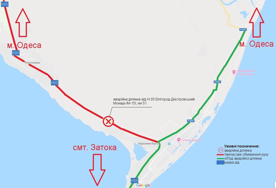 На трассе вводится временное ограничение движения. Служба опубликовала схему объезда по дороге Н-33 - Каролино-Бугаз – Грибовка – Санжийка - М-27, передает Лига.