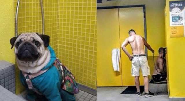 На одном фото в душевой сидит мопсик в костюмчике, а на второй – двое мужчин в шортах. Один из них полностью залез в мойку, а второй поливает его водой.