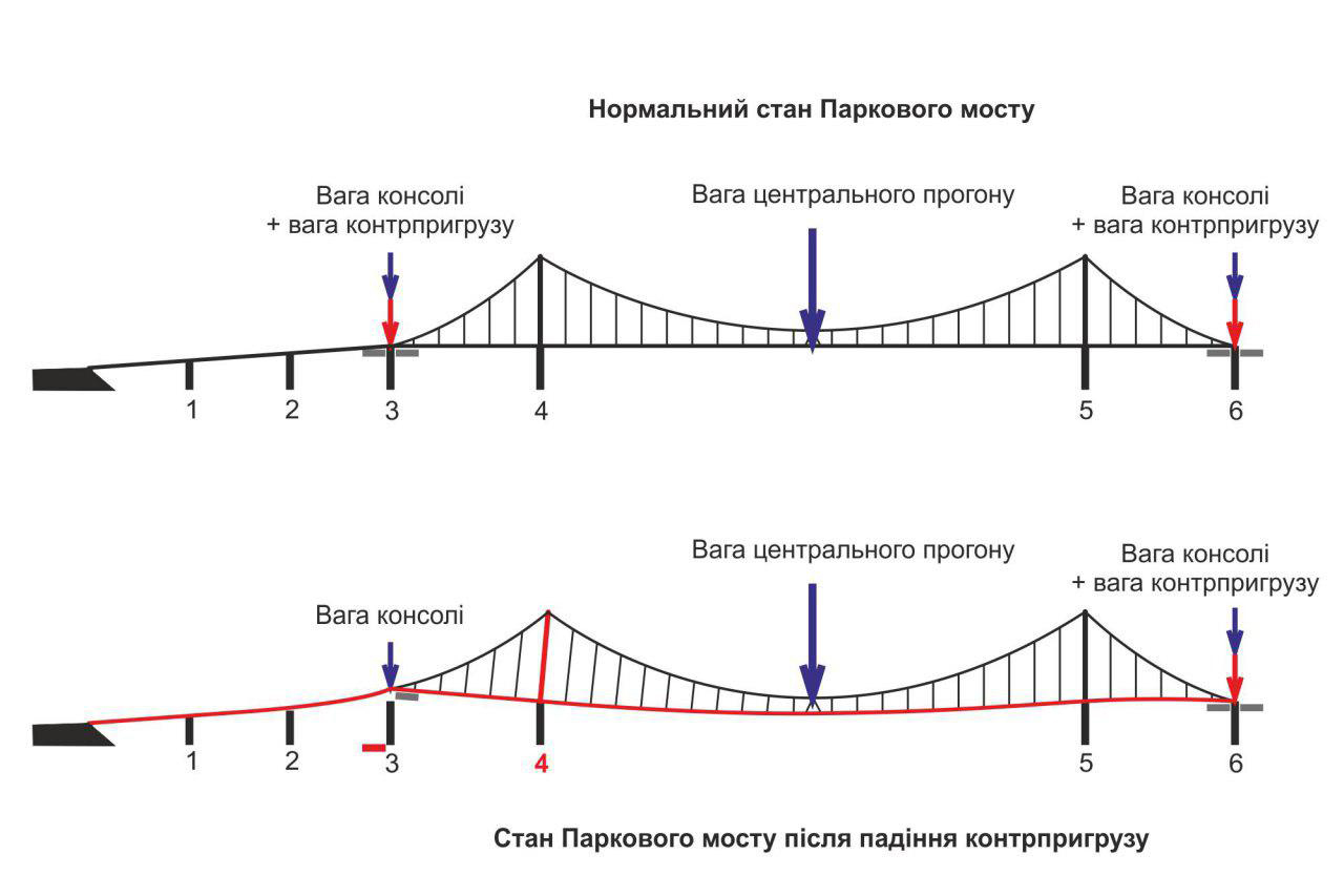 Схема повреждения Паркового моста (автор Виктор Петрук): На изображении в верхней части рисунка, с левой стороны, видно крепление моста, которое обеспечивается весом консоли и весом контрпригруза. На нижнем изображении после обвала контрпригруза видно, как провисает мост: веса оставшейся консоли недостаточно для удержания моста с одной стороны