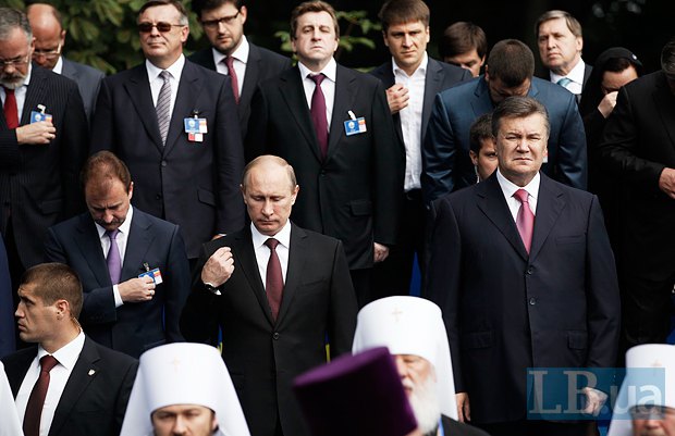 Праздничный молебен на Владимирской горке превращается в махровое торжество политического православия. Служит сам Патриарх Кирилл. Виктор Янукович и Владимир Путин истово крестятся. При этом у Кирилла охраны в два раза (!) больше, чем у двух президентов-параноиков вместе взятых.