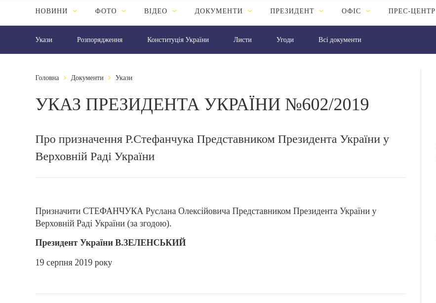 В укаде №601/2019 говорится: "Уволить Стефанчука Руслана Алексеевича с должности представителя президента Украины в Верховной Раде Украины".