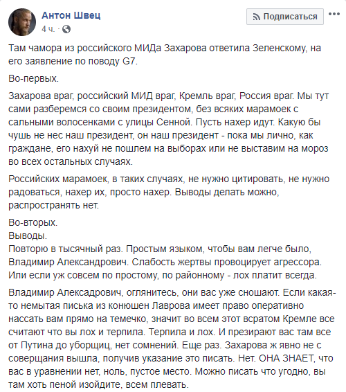 Политический и военный эксперт Алексей Арестович хочет увидеть реакцию Зеленского на пост Захаровой.