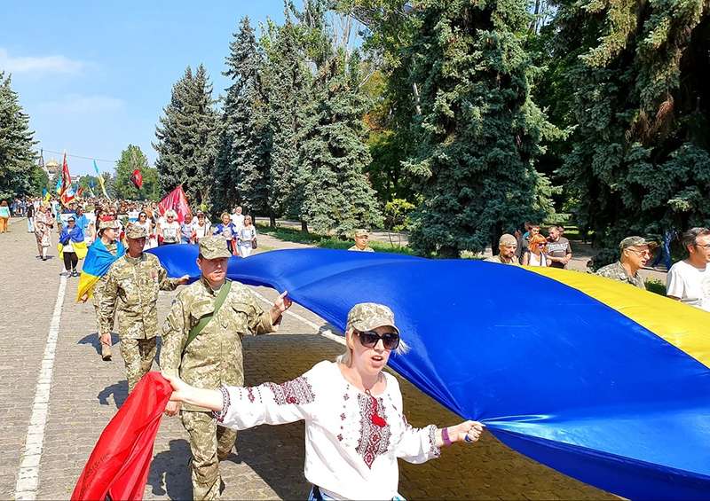 В колоне шли представители ветеранских организаций, волонтеры, родственники бойцов, погибших на востоке Украины, активисты и общественники. По ходу движения к участникам мероприятия присоединились горожане, многие из которых — в вышиванках.