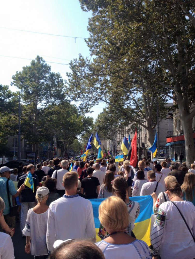 В субботу, 24 августа, по случаю Дня Независимости Украины более 300 человек приняли участие в Марше патриотов и защитников Украины. Он стартовал на Театральной площади, возле Одесского национального академического театра оперы и балета.