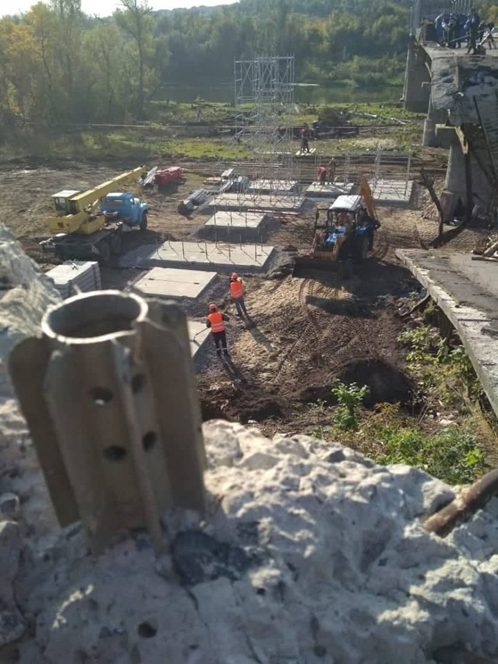 Работы у излома моста выполняют работники компании «Уктрансміст», инженерная и пиротехническая группа ГСЧС. Последняя обеспечивает очистку территории от взрывоопасных предметов.