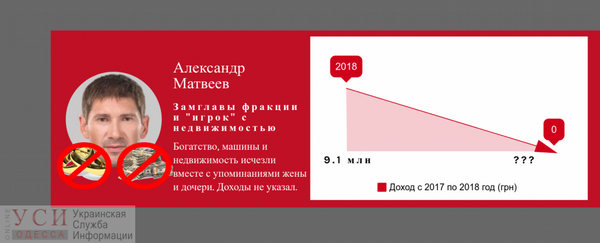 Добавим, что в последней декларации Матвеев не указал даже свою зарплату и другие виды доходов. А ведь в 2016 году он получил более 3,3 млн. грн. процентов от вклада в банк, а его жена – почти 8,9 млн. грн. процентов. Также растаяли вклады Матвеева. Если в 2016 году на его счету в “Альфа Банке” было почти полмиллиона гривен, то сейчас – всего 70 грн. Вместе с упоминанием жены пропали и ее активы на 17,5 млн. грн. Зато у депутата, откуда то появились 2,5 млн. грн. наличкой. Что, конечно, не компенсирует, всех его финансовых потерь.