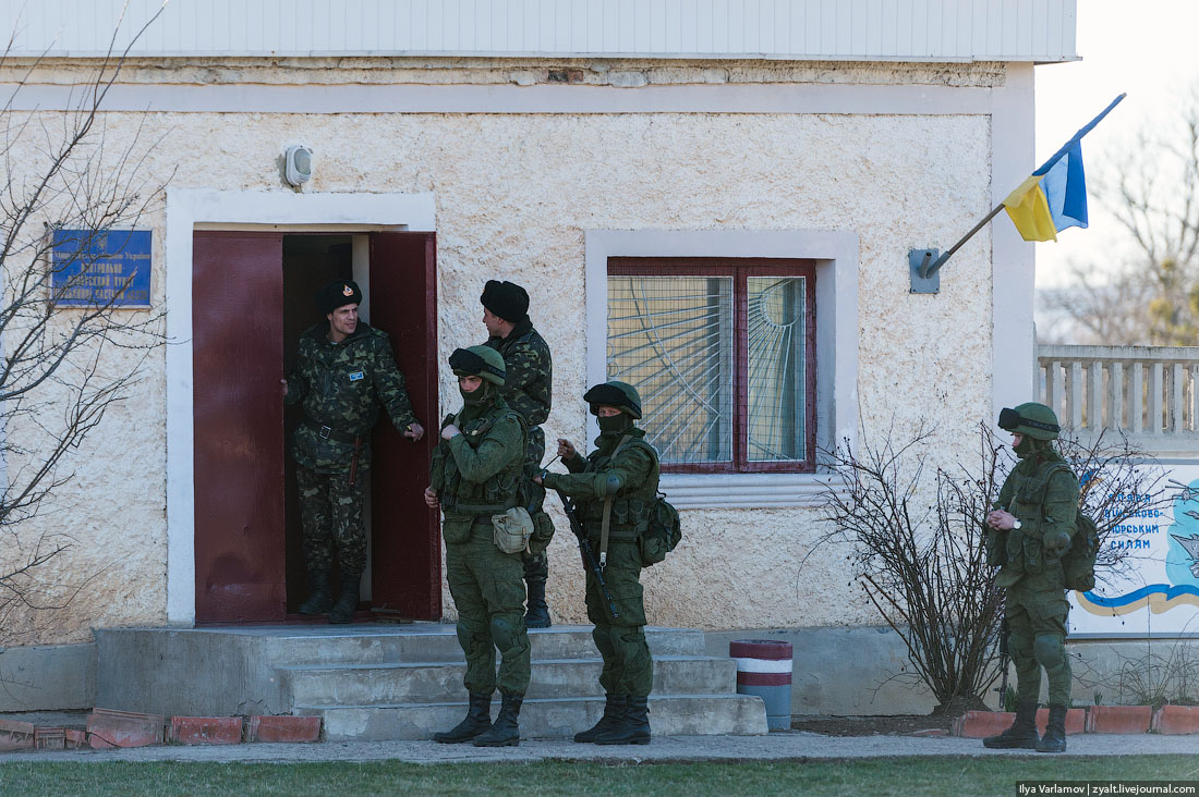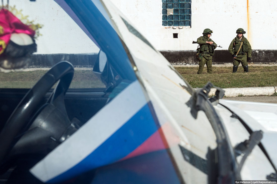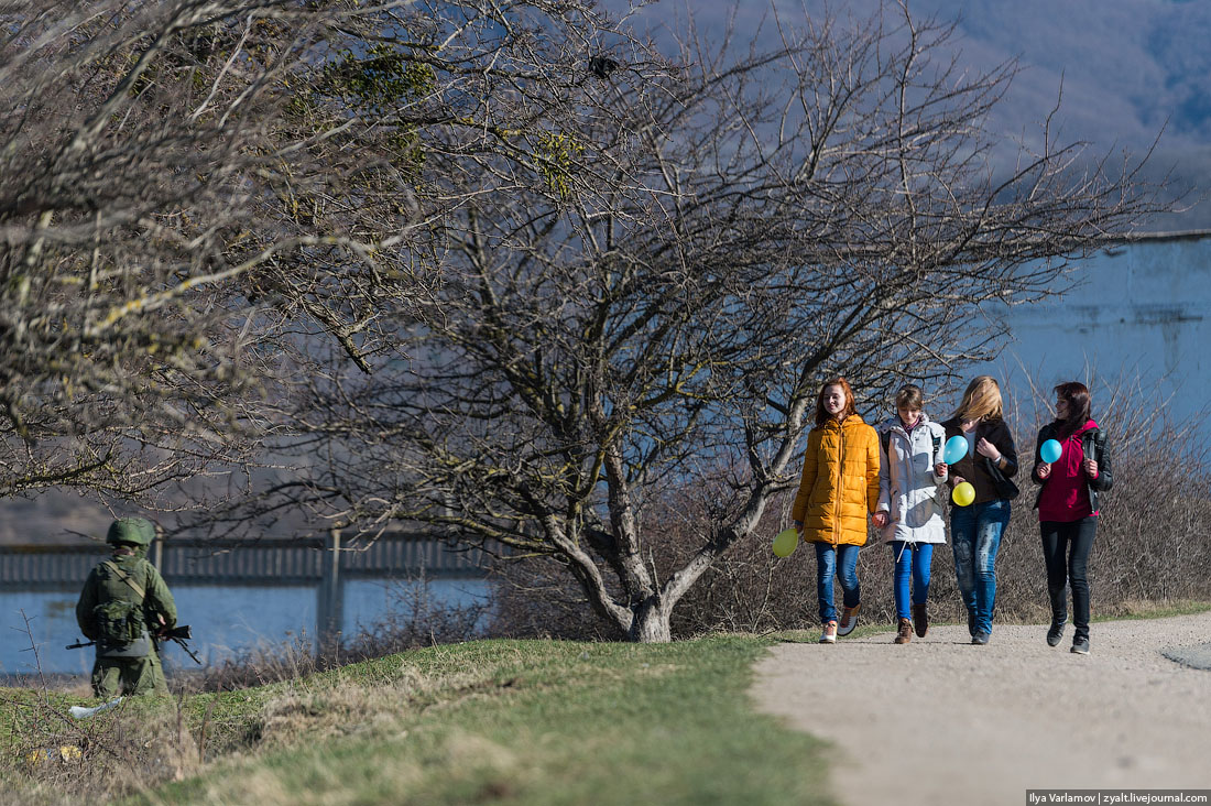13. Тут очень странная ситуация. Сюда приехали российские военные, разбили лагерь и заблокировали все выезди из военной базы. Украинским военным предложили перейти на сторону народа. Стороной народа сейчас называют новые власти Крыма, которые новые власти Киева не признают. Командир этой части отказался подчиняться новым властям Крыма. Вскоре пришли местные жители, а это в основном жены и родственники военнослужащих. Они испугались, что солдат пошлют в наступление и будет конфликт, поэтому они тоже встали в оцепление между российскими солдатами и украинскими, чтобы никто не рыпался. Они попросили командира отпустить солдат по домам и не спорить с народом. Командир послал их и сказал, что остается верен присяге. На переднем плане стоят местные казаки, так они сами представились. Жители из оцепления на всякий случай повесили российские флаги, чтобы показать, что российские войска им ближе.