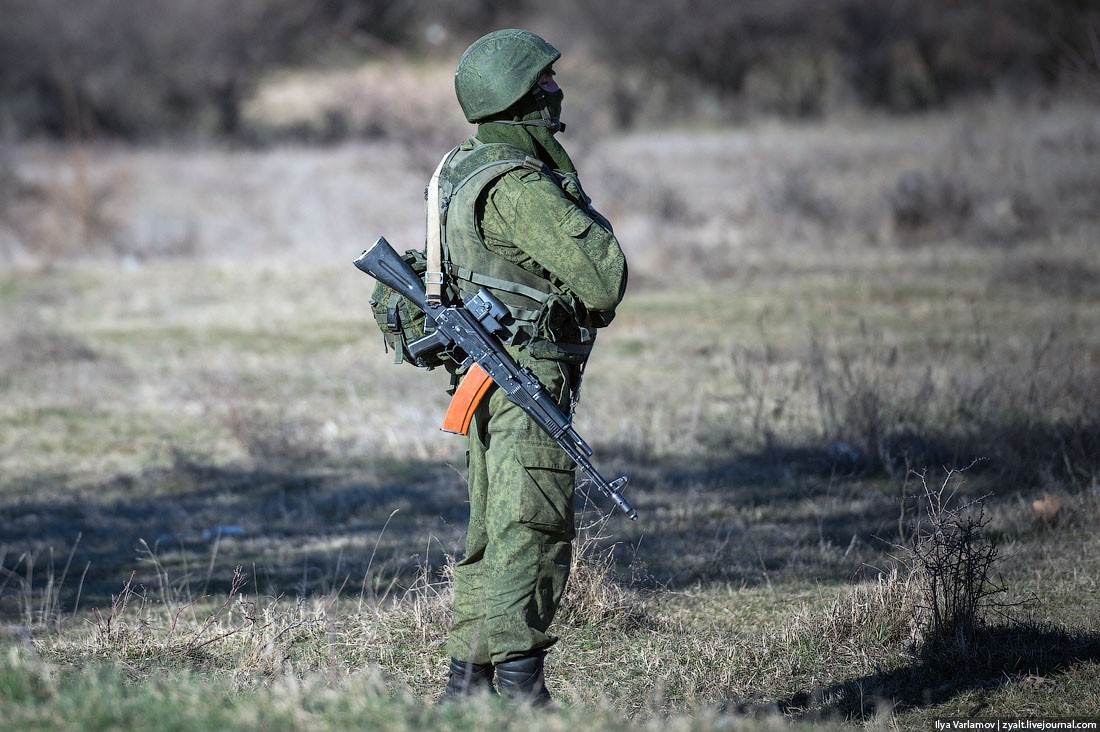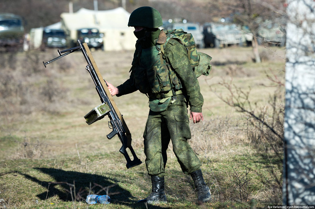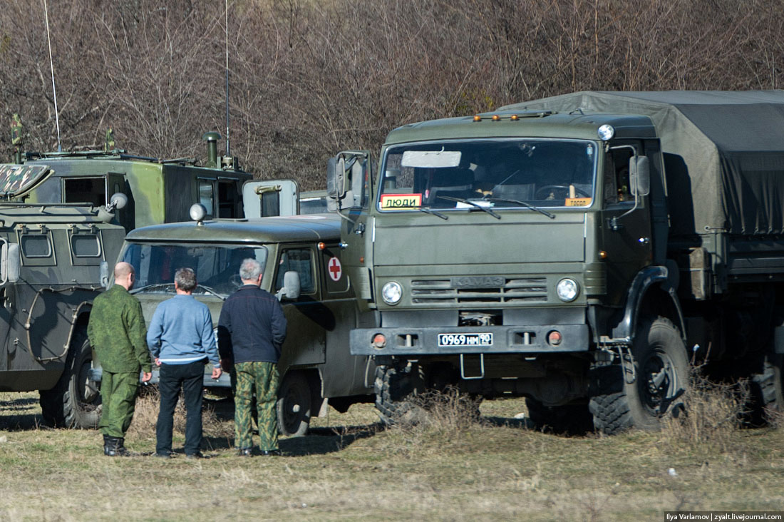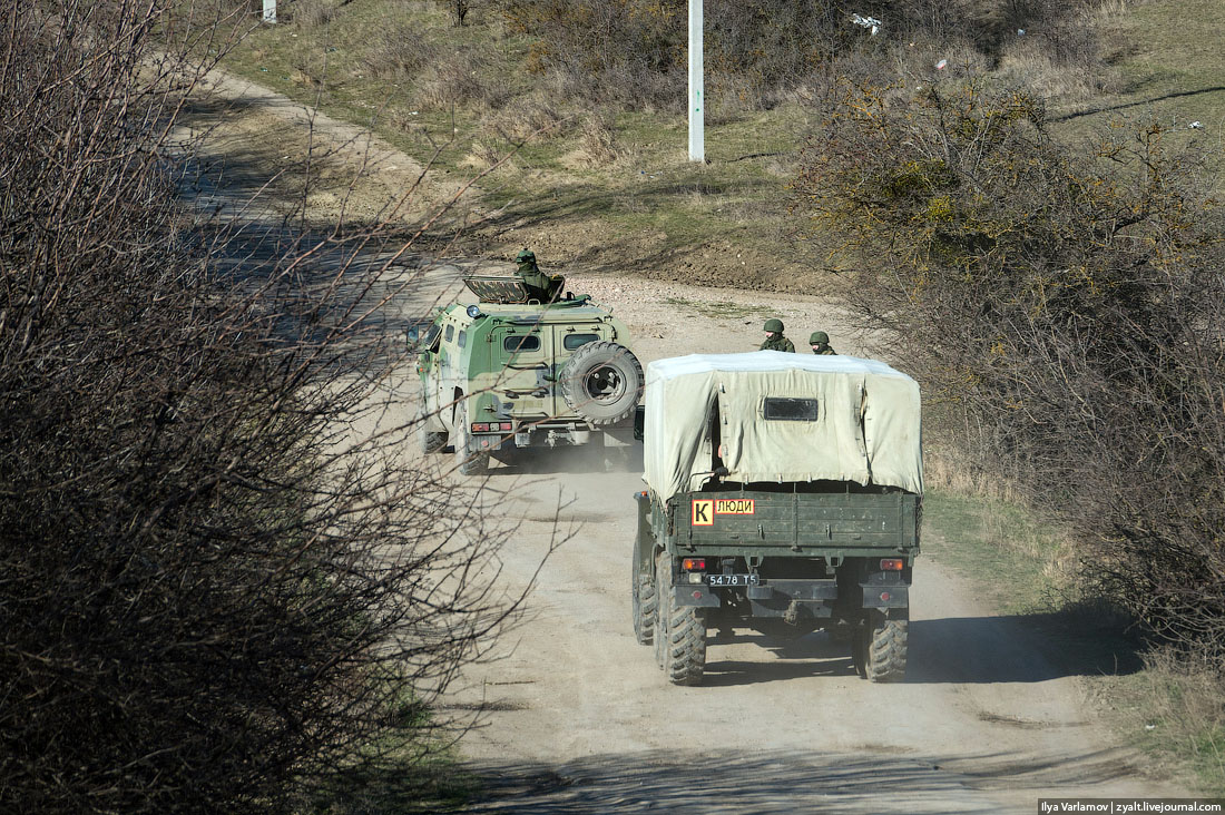 23. Номера сняты, судя по следу недавно. Вообще, официально это не наши Тигры, а Тигры «самообороны Крыма». Откуда у Самообороны Крыма российская военная техника, никто не объясняет. Официально российские военные ничего не блокируют. Но все понимают, что это российская техника и российские солдаты. Такого оружия и форму у местных никогда не было и быть не может.