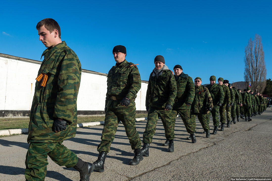 Солдаты в Крыму действительно есть, хотя в последние дни их стало меньше. Основные действия переместились от государственных учреждений к военным частям. С солдатами здесь тоже очень непонятная история. Официально солдаты себя не идентифицируют, хотя все понимают, что это русские солдаты. Но как захватчиков их точно не воспринимают. Со стороны все напоминает какие-нибудь совместные российско-украинские учения. Нет никакой враждебности и негатива между сторонами. Может быть, конечно, российские солдаты кому-то и не нравится, но явного возмущения и недовольства я ни разу не встречал. Люди фотографируются с военными и техникой и выглядит все это очень естественно.
