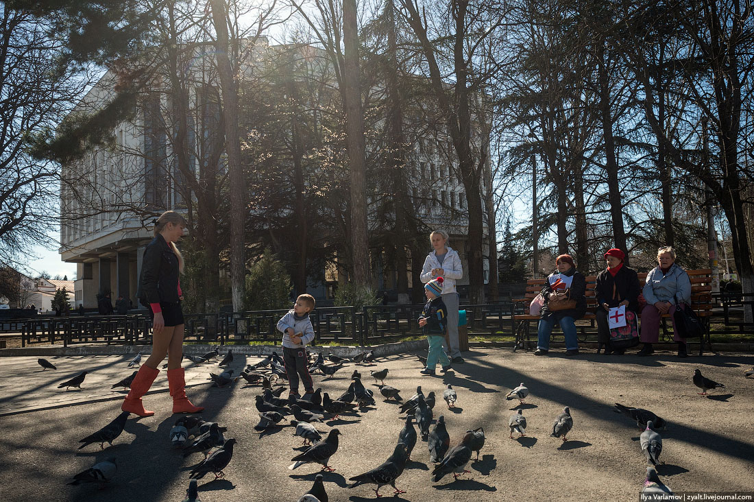 03. В самом городе все спокойно. Накануне вывели солдат, которые несколько дней перекрывали улицы вокруг крымского парламента. Сейчас все открыто, люди спокойно гуляют с детьми. Обстановка мирная.