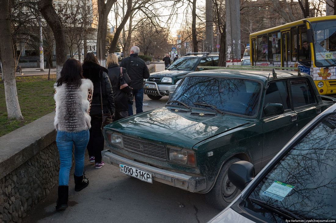 02. В аэропорту все спокойно, все работает в нормальном режиме. Все те же таксисты назойливо предлагают свои услуги, работает автопрокат, кафе и сувенирные лавки. Выхожу из здания, ко мне сразу подходит какой-то мужчина с спортивном костюме с георгиевской ленточкой и начинает разговор. Мужчина очень агрессивно рассказывает, что все спокойно и все хорошо. Хотя, я даже усомниться в этом не успел. По площади гуляют несколько солдат с автоматами без опознавательных знаков. Я спрашиваю мужика с георгиевской ленточкой, кто это такие.