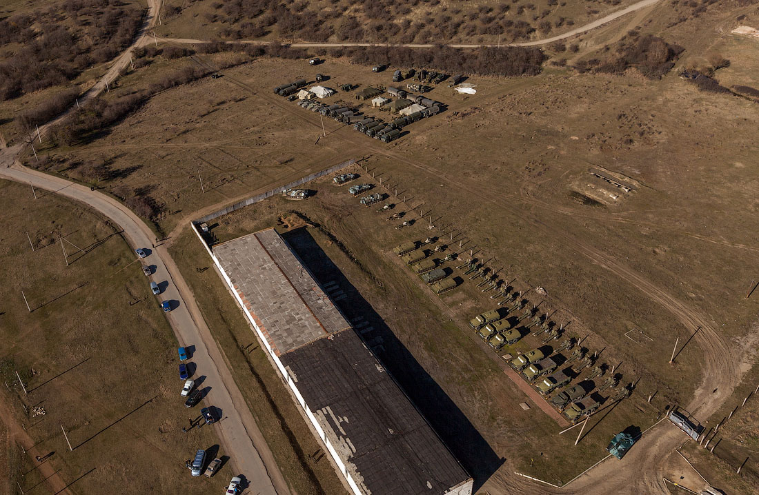12. В Симферополе действительно ничего не происходит, поэтому принимаю решение ехать дальше. В 20 км от города, в поселке Перевальное, есть украинская военная часть, которую заблокировали российские военные.
