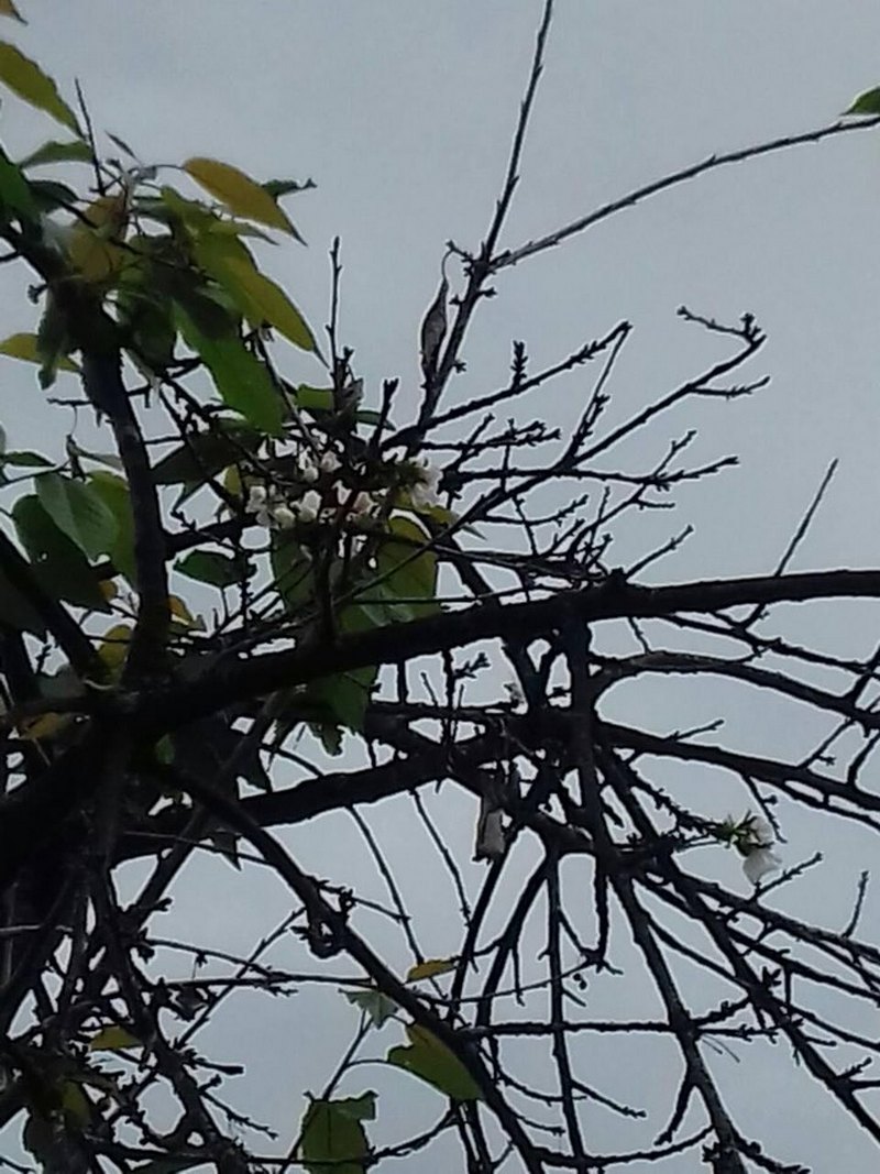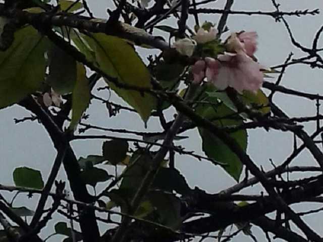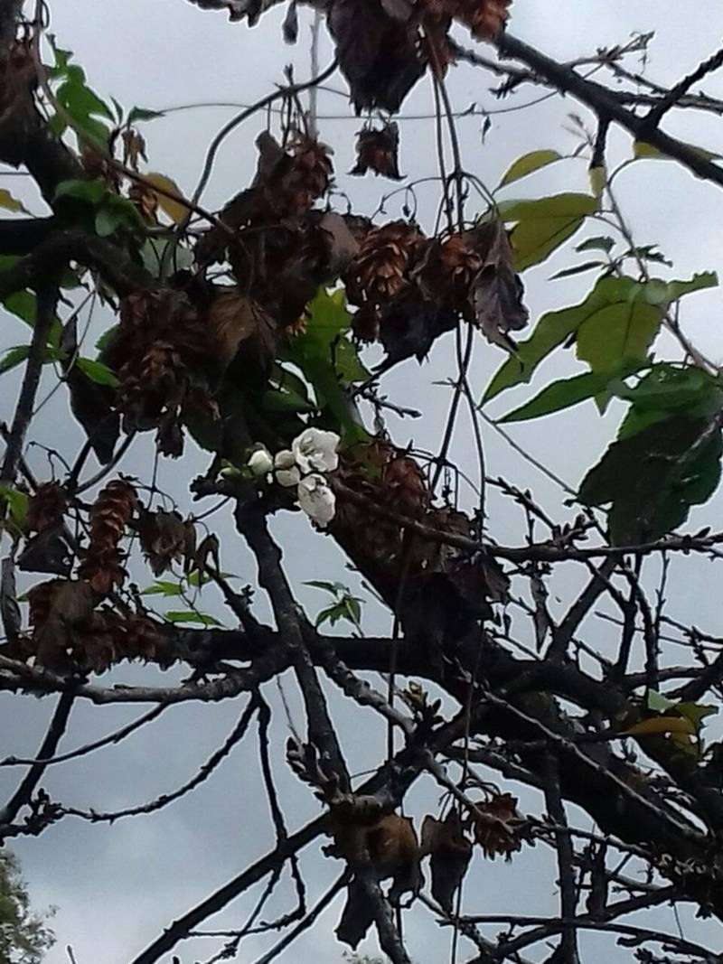 На снимках видно, что многие деревья уже почти сбросили листья, а на голых ветках вместе с остатками старой листвы появились белые и нежно-розовые цветы. Есть еще и зеленые яблони с плодами, на некоторых ветках которых набухли почки и распустились цветы.