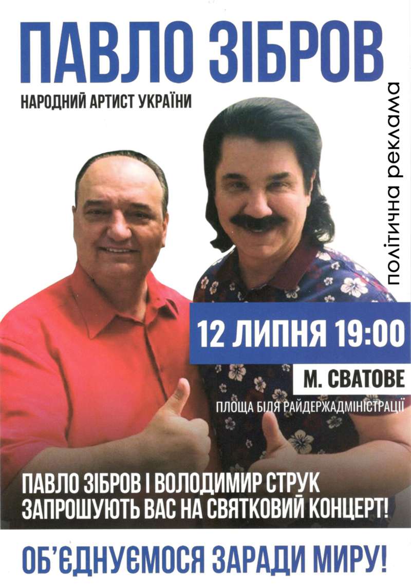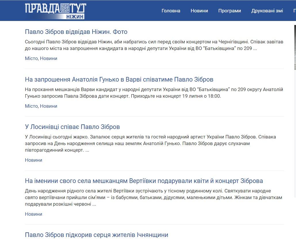Певец Павло Зибров, он же ЧП Зибров П.М., несколько раз выступал в поддержку кандидата-мажоритарщика Анатолия Гунько с 209-го округа (Черниговская область). Он пел в селе Иваница 28 июня, в селе Лосиновка - 29 июня, в селе Вертиевка - 1 июля, а в селе Варва - 19 июля.