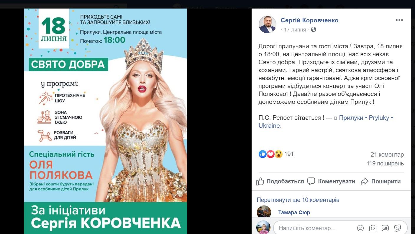 Однако концерт Ольги Поляковой, организованный им в Кобеляках 19 июля, в официальных расходах таки пришлось записать.