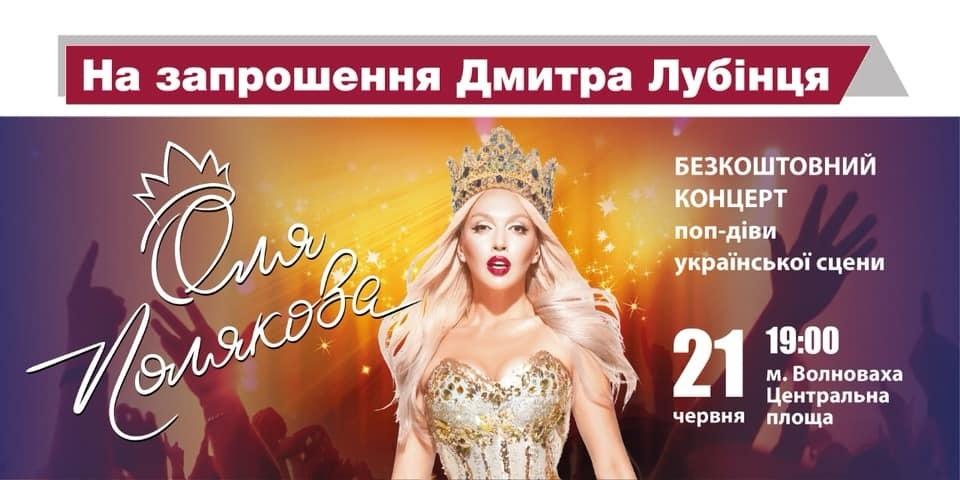 Дмитрий Лубинец из округа № 60, что в Донецкой области, также приглашал Ольгу Полякову. Она давала концерт в городе Волноваха 21 июня. Лубинец зарегистрировался как кандидат 19 июня, поэтому выступление Поляковой должен был оплатить официально. Но никаких упоминаний об этом концерте в его отчете нет.