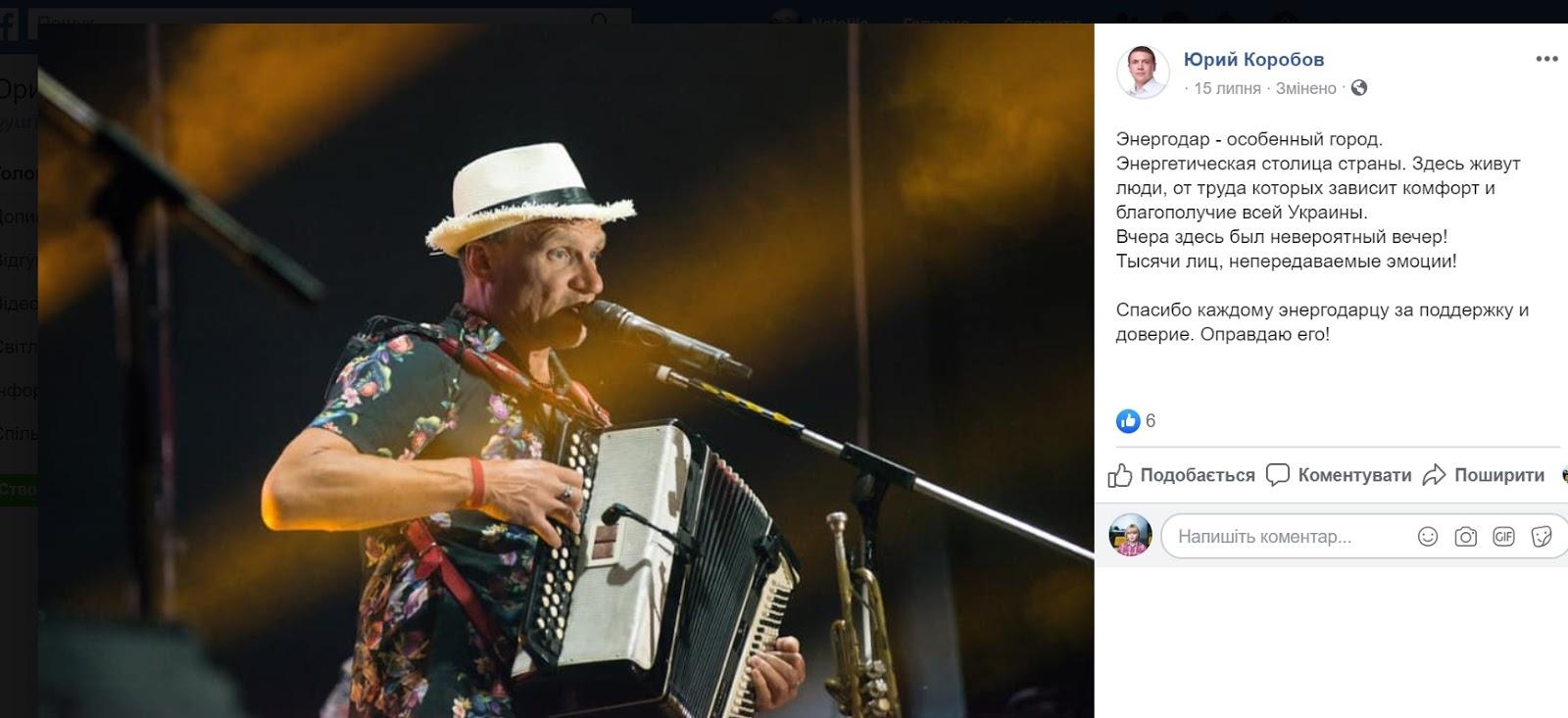 15 июля в Энергодаре выступал Олег Скрипка. Всю эту информацию Коробов сам публиковал на своей странице в Facebook, однако в финотчете отметил лишь 100 000, которые потратил на организацию концертов.