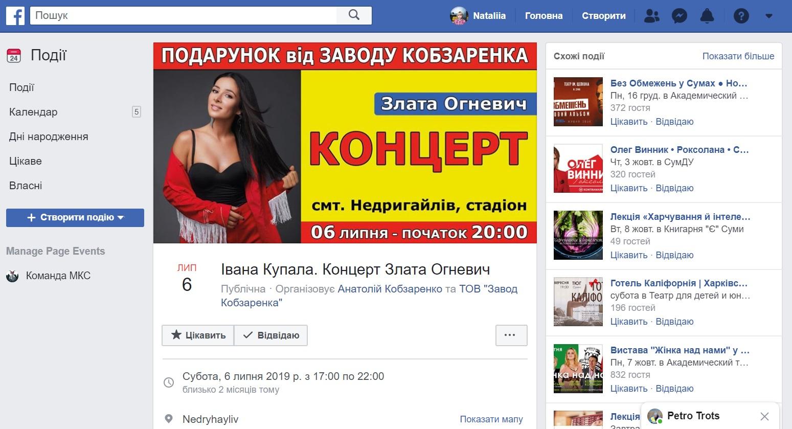 Самовыдвиженец из Сумщины Анатолий Кобзаренко (округ №161) 6 июля устроил концерт Златы Огневич на стадионе поселка Недригайлов. На афишах было указано, что это мероприятие организовывает "завод Кобзаренко" (производит тракторные прицепы).