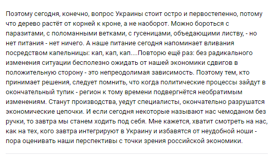«Поэтому тем, кто принимает решения, следует помнить, что когда политические процессы зайдут в окончательный тупик — регион к тому времени подвергнется необратимым изменениям. Станут производства, уедут специалисты, окончательно разрушатся экономические цепочки. И если сегодня некоторые называют нас чемоданом без ручки, то завтра мы станем ходить под себя. Мне кажется, хватит смотреть на нас, как на тех, кого завтра интегрируют в Украину и избавятся от неудобной ноши — пора оценивать наши перспективы с точки зрения российской экономики».